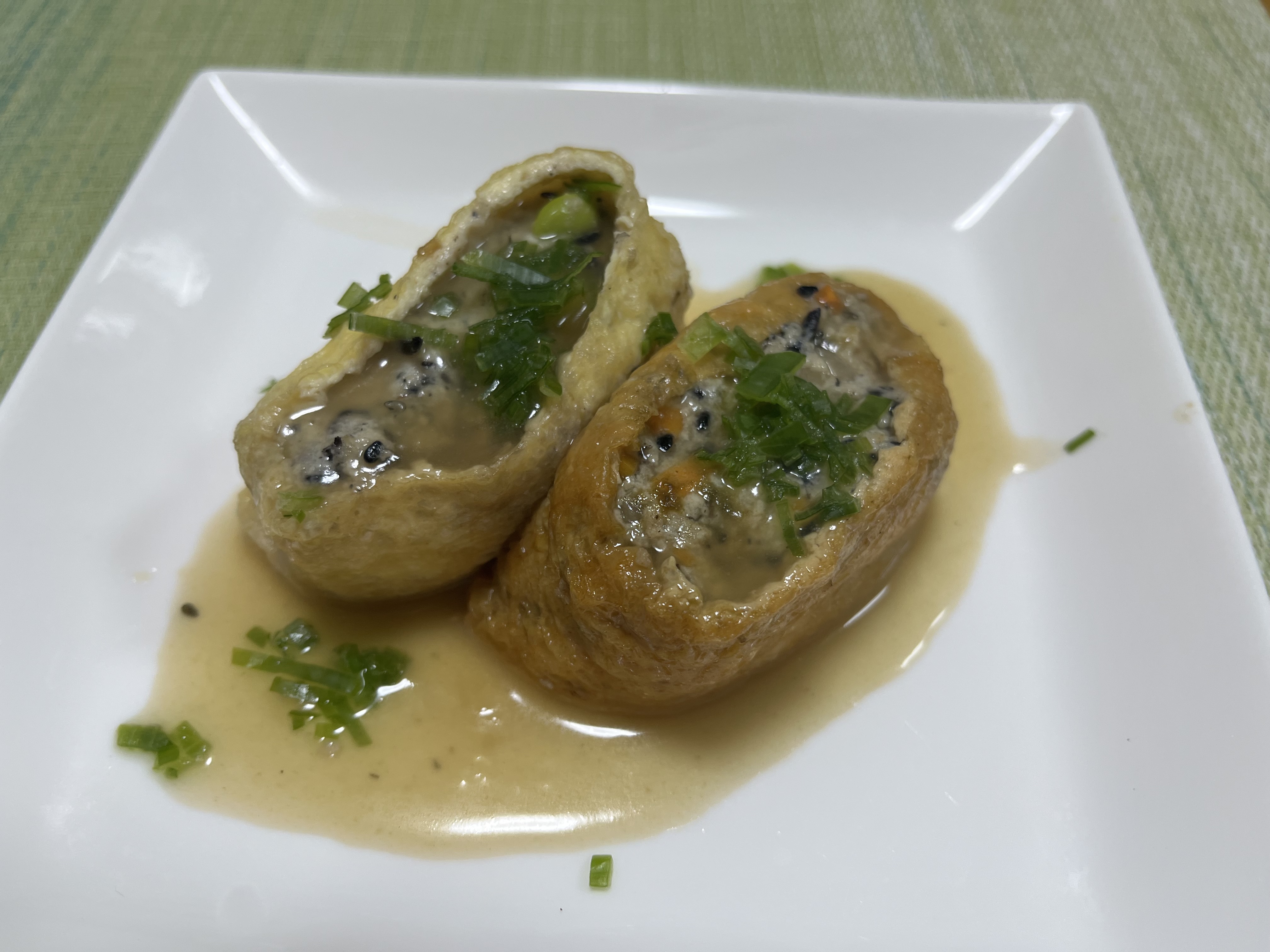 ④ ボールにひき肉、豆腐、玉ねぎ、人参、ひじき、枝豆、黒ゴマ、塩コショー、生姜のする下ろし、片栗粉を入れて混ぜ、しっかり混ぜたら、油揚げに詰める